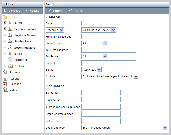 With the exception of the EDI-partner-specific to and from fields, these fields can apply to e-mail and EDI messages alike. Although the Content field searches the text of both e-mail and EDI documents, it should be noted that the text search differs between the two. In an e-mail message, all displayed text is searched. However, in an EDI document, the text searched is the native EDI only. Segment and element names, however, are excluded from the native EDI search and will not cause matches. The bottom half of the advanced criteria search screen applies to EDI documents only. It allows you to narrow an EDI search down by EDI addressing IDs, control numbers, reference numbers, and document types. When you have finished entering search criteria, click the upper Submit button to generate the search results. Your advanced search result output may be sorted according to any column, and you can open any document listed in the search result output. |