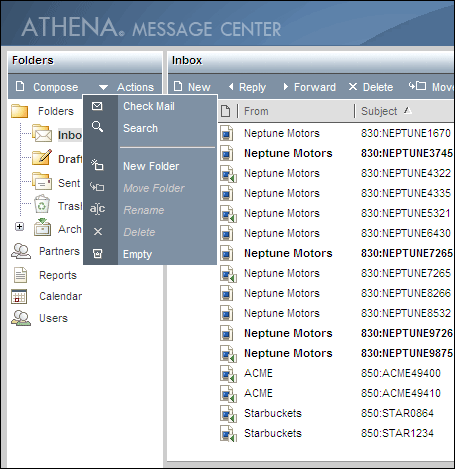 Because trading partner organization only applies to EDI documents, Athena automatically creates an E-mail folder for this view. This folder stores all e-mail messages. You will not find e-mail messages, even if they are to/from one of your EDI trading partners, in any folder other than the E-mail folder when you are in the trading partner view. Classic ViewThe classic view is the traditional view used by most e-mail applications. It starts you out with the standard folder skeleton consisting of an Inbox, Drafts, Sent, and Trash folder. From this skeleton, you can customize subfolders using the Actions drop-down menu found at the top of the folder tree, as shown in the next graphic.