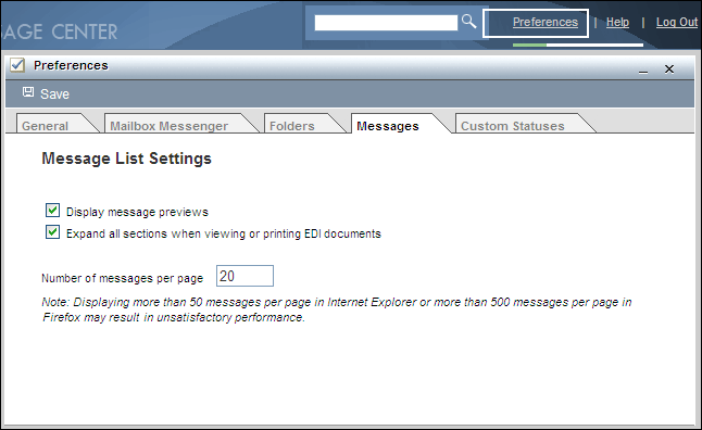 Customizing Message DisplayFrom the Message tab found in Athena's preferences, you can choose to display message previews for unread messages as well as the number of messages that display per page, as shown in the next graphic. In addition, you can choose whether some "additional information" sections in an EDI document are initially expanded or collapsed when viewing or printing.